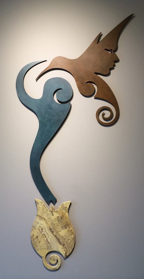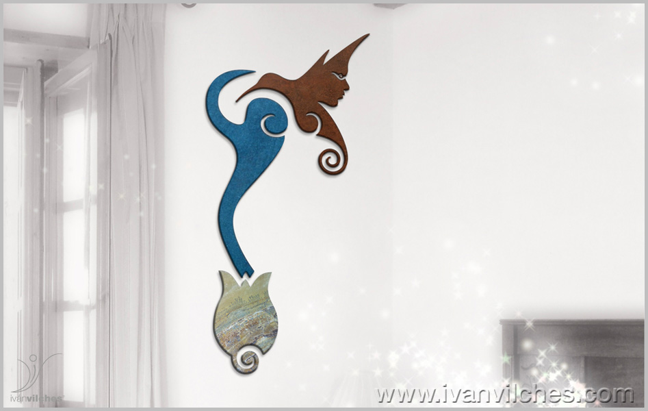 sculpture de wall realizada en piedra natural, acero cortén, y latón.