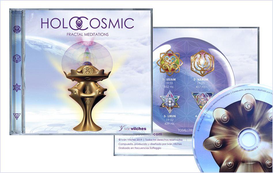CD en formato Jewel Box con libreto de 8 páginas con las imágenes de cada Holograma para meditar y conectar.