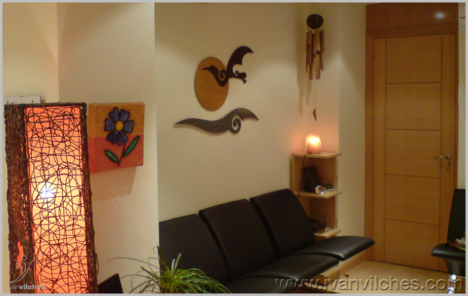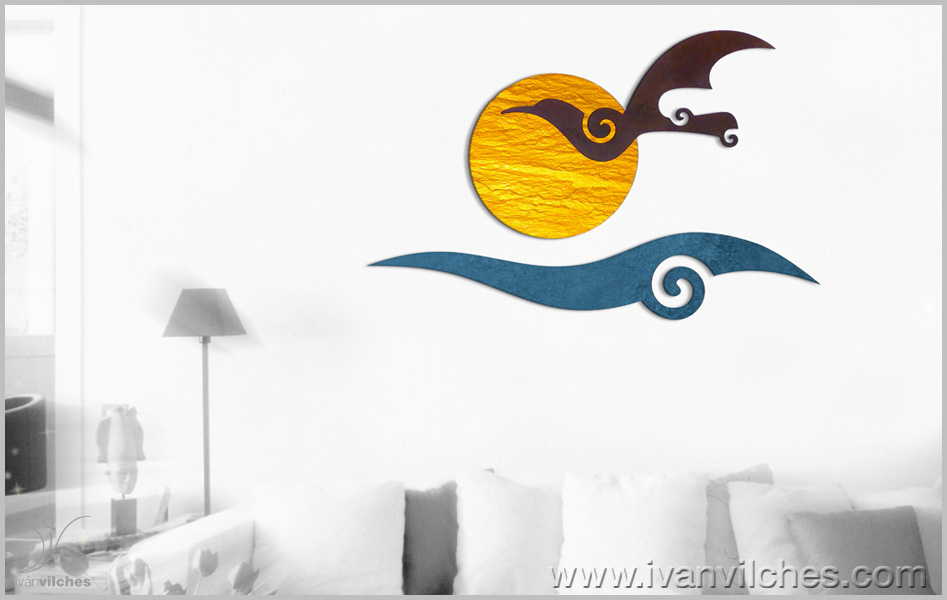 Escultura de pared realizada en piedra natural, acero cortén, y latón.